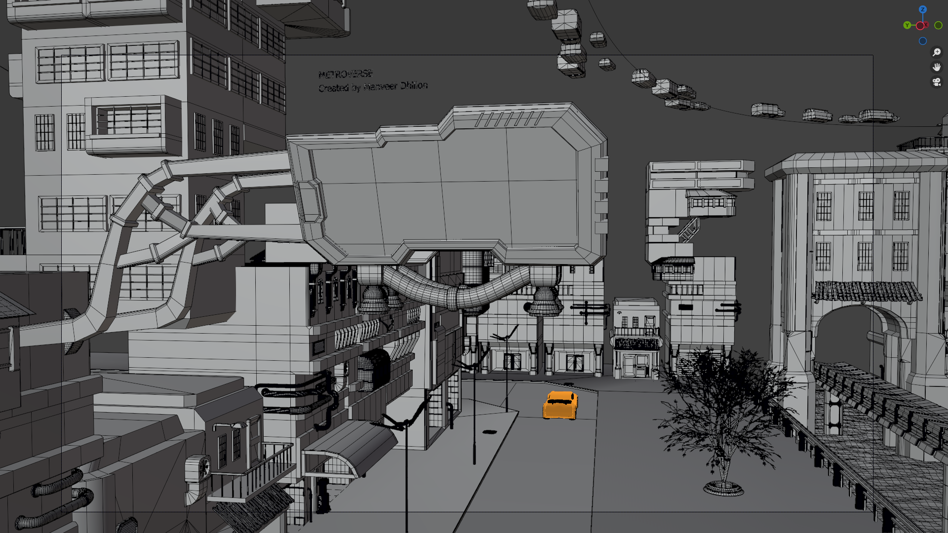 Shaded metroverse scene with a wireframe outline