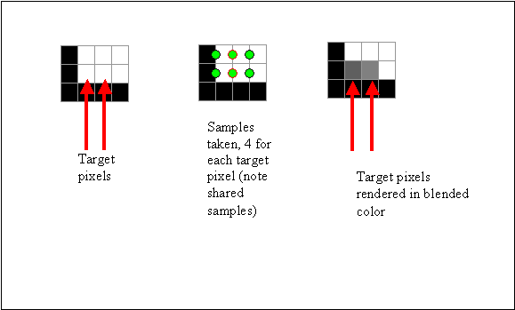 Multi-sampling is similar to super-sampling but does not require the image to be scaled up and down. The technique reuses samples from adjacent pixels to make the sampling process more efficient. Figure 4 is an example of how multi-sampling is accomplished using four samples.
