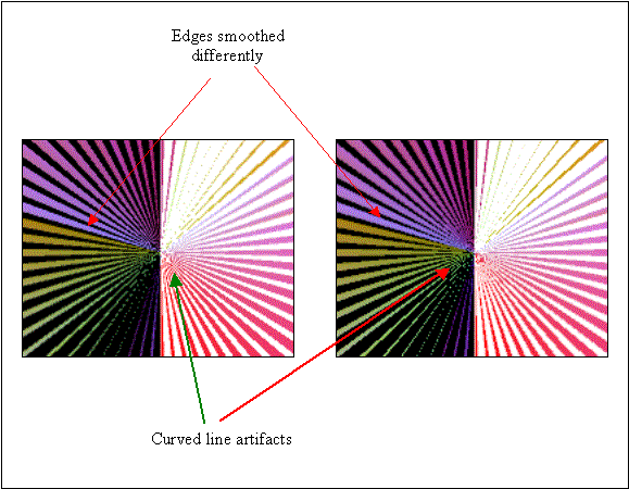 It is also important to note that graphics vendors use different techniques, algorithms and hardware to render FSAA images. It is difficult to directly compare the results from different vendors’ graphics cards or even across graphic card families from a single vendor, as the implementation of FSAA may vary between the products. Figure 6 contains screen image captures of the same graphic produced by two different graphics cards from two different manufacturers. Both used FSAA via multi-sampling with a sample size of two.